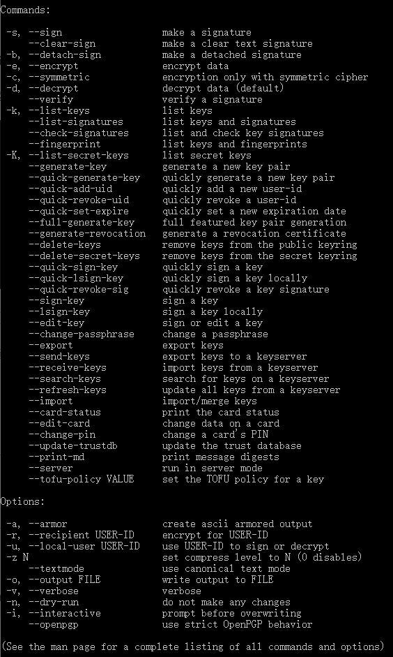 gpg [选项] [命令] [文件名]